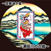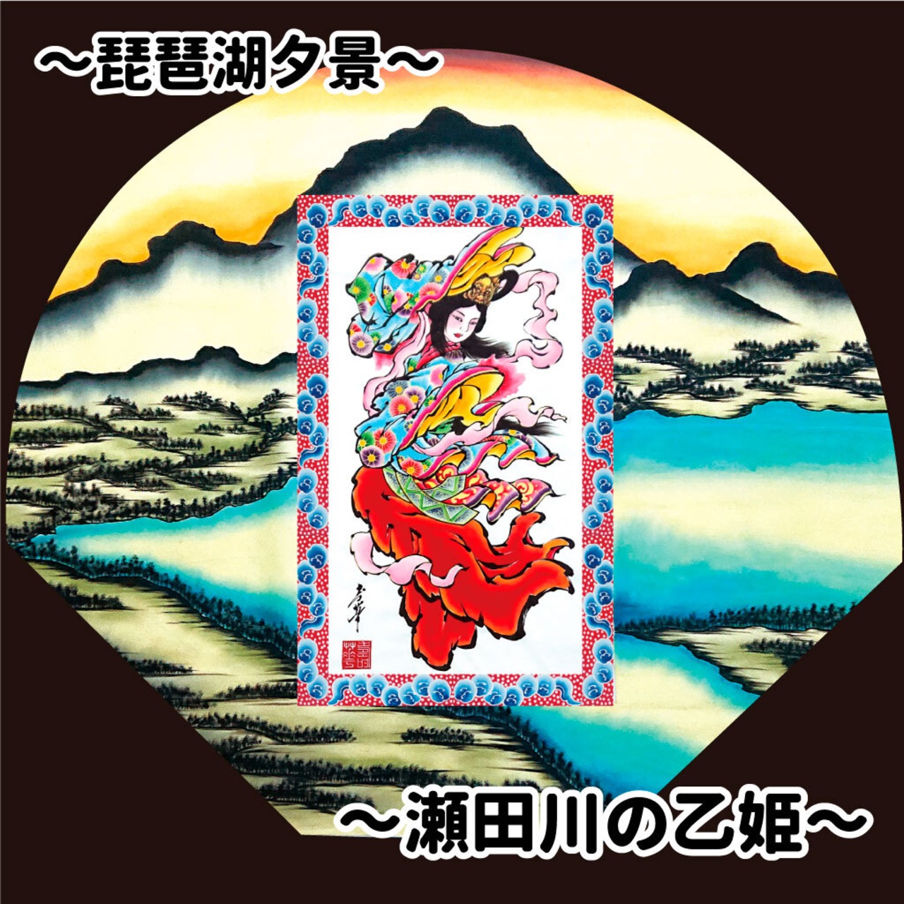 鏡絵は琵琶湖上で繰り広げられる緊迫した大百足との戦いをダイナミックに描いていただきました。袖絵は大百足退治の後の、穏やかな夕焼けの光に包まれた琵琶湖を日本画調に描いていただき、見送り絵は俵藤太に百足退治を依頼した龍神の姫を描いています。