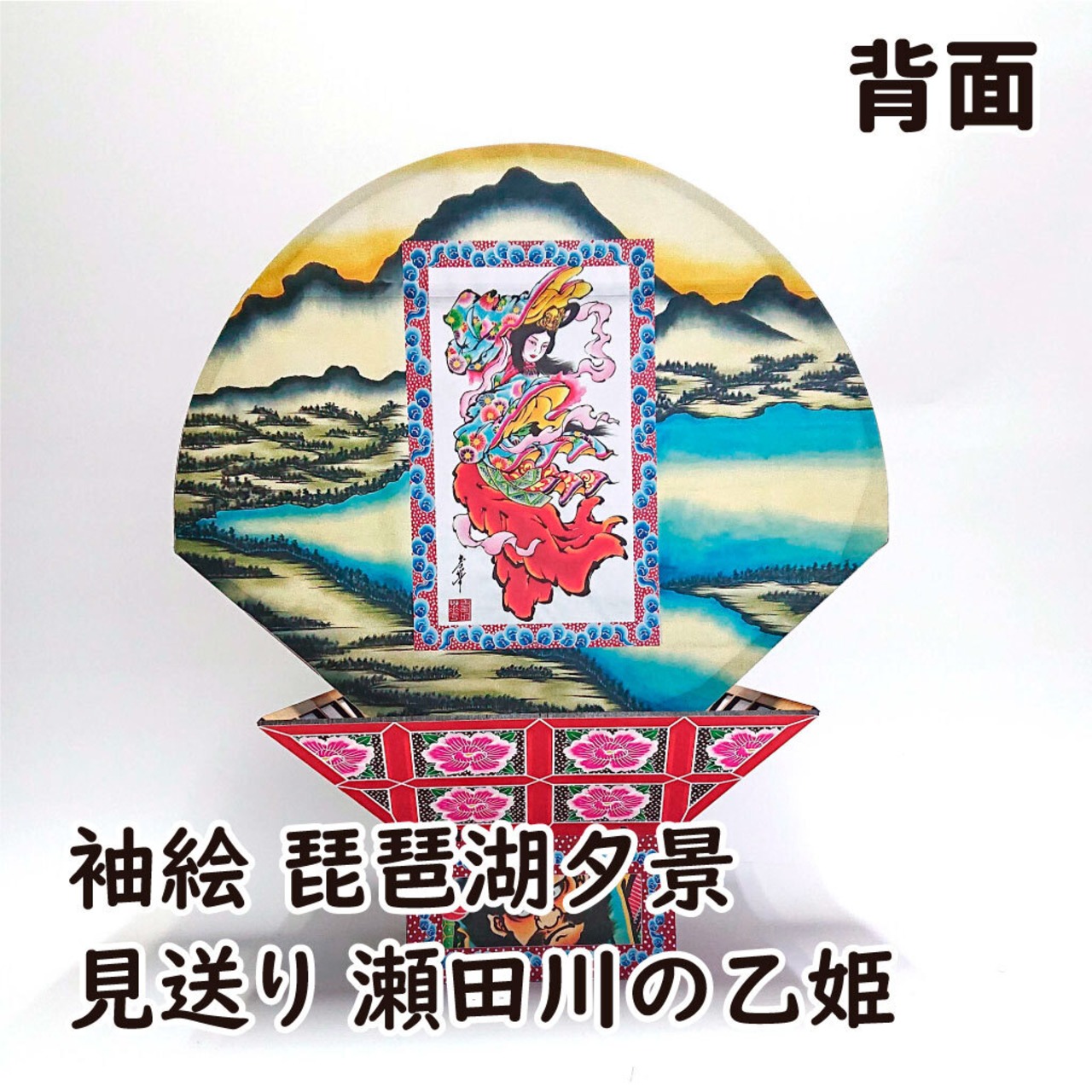 鏡絵は琵琶湖上で繰り広げられる緊迫した大百足との戦いをダイナミックに描いていただきました。袖絵は大百足退治の後の、穏やかな夕焼けの光に包まれた琵琶湖を日本画調に描いていただき、見送り絵は俵藤太に百足退治を依頼した龍神の姫を描いています。