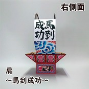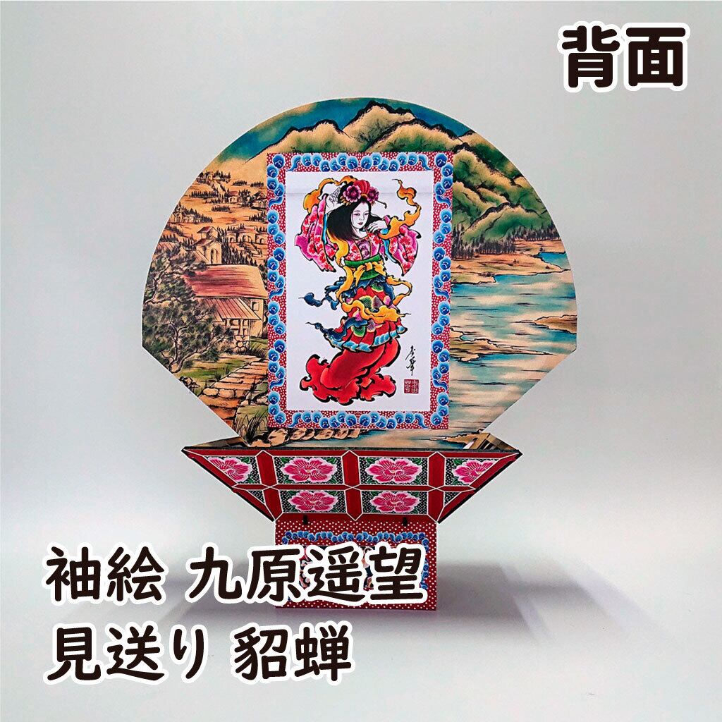 見送り絵は美女連環の計の重要人物、貂蝉(ちょうせん)を、両肩には馬にまつわるおめでたい言葉「馬到成功(ばとうせいこう:物事を始めるとたちどころに、すみやかに成功を収めること)」と、「万事馬九行久(ばんじうまくいく:九頭の馬、すなわち九つの運気(勝負運、金運、出世運、家庭運、愛情運、健康運、商売繁盛、豊漁豊作、受験合格)がもたらされ、万の事の成功や繁栄を意味する当て字)」を配しています。
