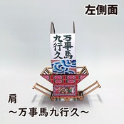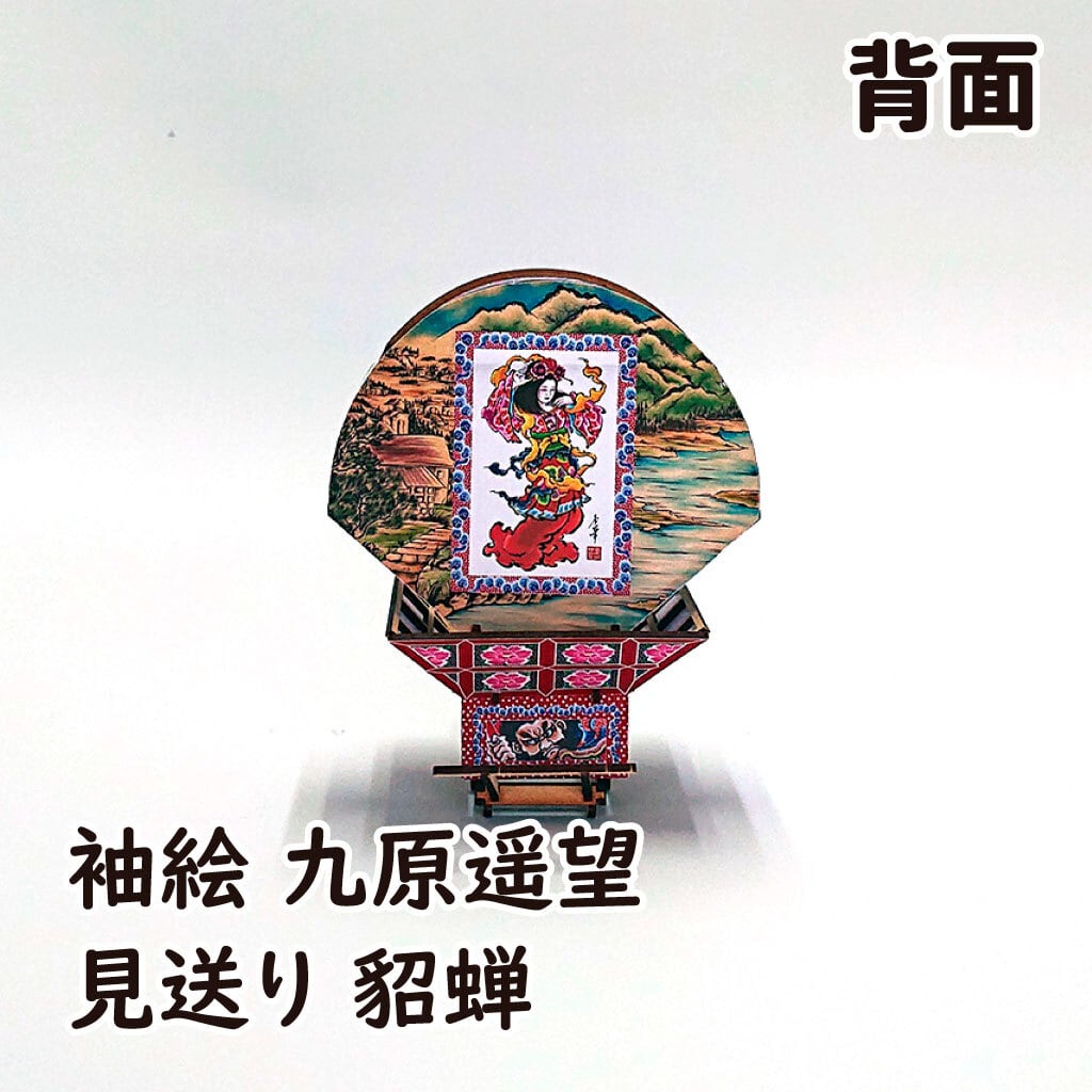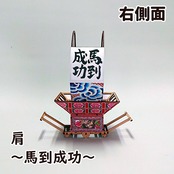 見送り絵は美女連環の計の重要人物、貂蝉(ちょうせん)を、両肩には馬にまつわるおめでたい言葉「馬到成功(ばとうせいこう:物事を始めるとたちどころに、すみやかに成功を収めること)」と、「万事馬九行久(ばんじうまくいく:九頭の馬、すなわち九つの運気(勝負運、金運、出世運、家庭運、愛情運、健康運、商売繁盛、豊漁豊作、受験合格)がもたらされ、万の事の成功や繁栄を意味する当て字)」を配しています。