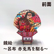 鏡絵は荒々しく赤兎馬を駆り、戦場を駆け抜ける呂布を、ダイナミックな筆致で表現しています。