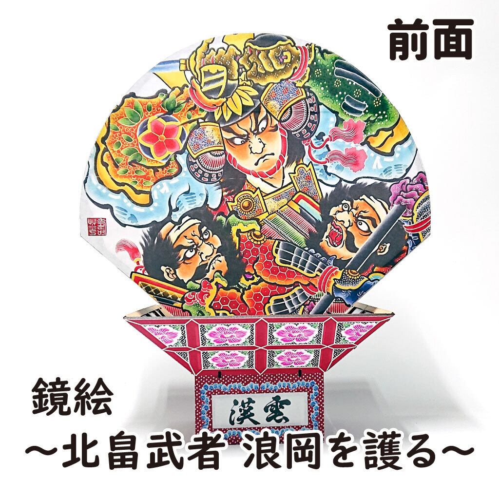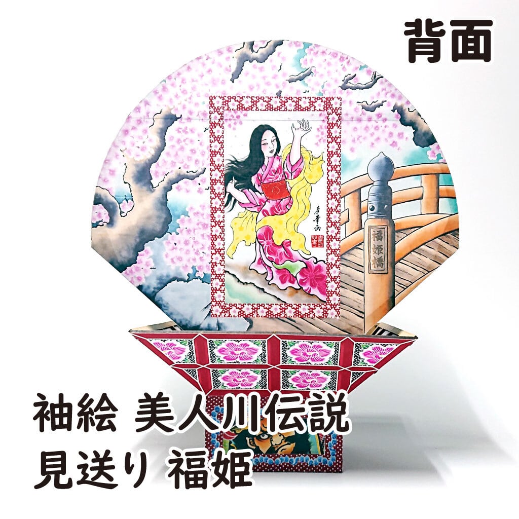 鏡絵はかつて浪岡一帯を治めていた浪岡北畠氏の荒武者が浪岡を守護する様をイメージして描いて頂きました。袖絵と見送りは浪岡に伝わる美人川伝説をモチーフにしており、神様のお告げに従い川の水で顔を洗ったことで絶世の美女となった福姫と、浪岡城址周辺に咲く桜が配されています。