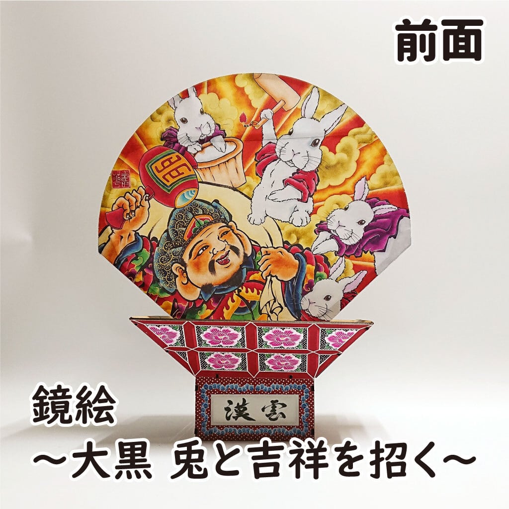 鏡絵は大黒様と兎が楽しく新年を祝う姿を描いて頂きました。大黒様は七福神のうちの一柱で、家運繁栄、商売繁盛、縁結びや五穀豊穣など様々なご利益を持っており、「因幡の白兎」伝説に登場する大国主命と習合し、そこから兎を眷属とするようになりました。