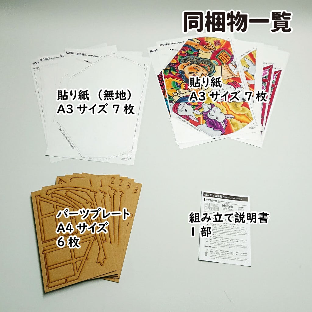 あらかじめカットされたパーツを組み立て、紙を貼り付けるだけで、本格的な扇ねぷたを作ることができるクラフトキットです。