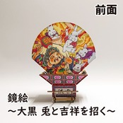 鏡絵は大黒様と兎が楽しく新年を祝う姿を描いて頂きました。大黒様は七福神のうちの一柱で、家運繁栄、商売繁盛、縁結びや五穀豊穣など様々なご利益を持っており、「因幡の白兎」伝説に登場する大国主命と習合し、そこから兎を眷属とするようになりました。