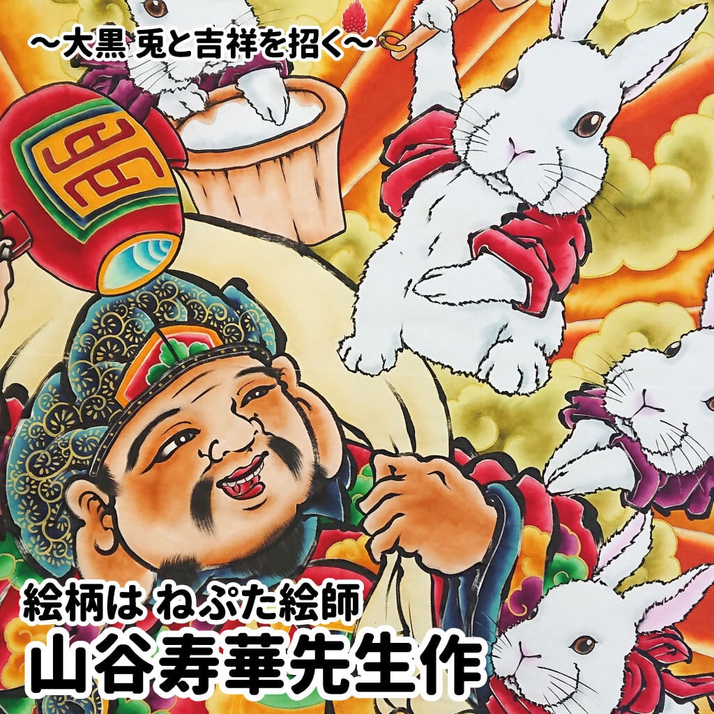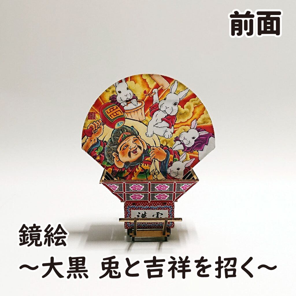 鏡絵は大黒様と兎が楽しく新年を祝う姿を描いて頂きました。大黒様は七福神のうちの一柱で、家運繁栄、商売繁盛、縁結びや五穀豊穣など様々なご利益を持っており、「因幡の白兎」伝説に登場する大国主命と習合し、そこから兎を眷属とするようになりました。