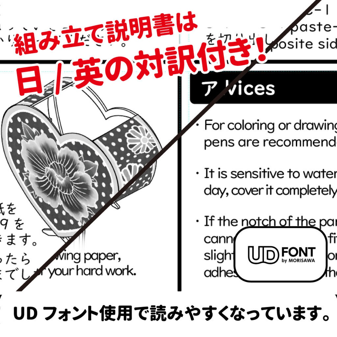 組み立て説明書では、日本語のほかに、英語での解説もしていますので、海外の方への贈答品にもお勧めです。
