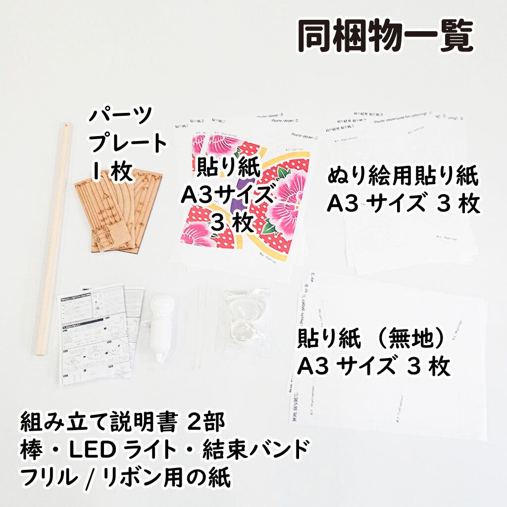 あらかじめカットされたパーツを組み立て、紙を貼り付けるだけで、本格的な扇ねぷたを作ることができるクラフトキットです。