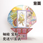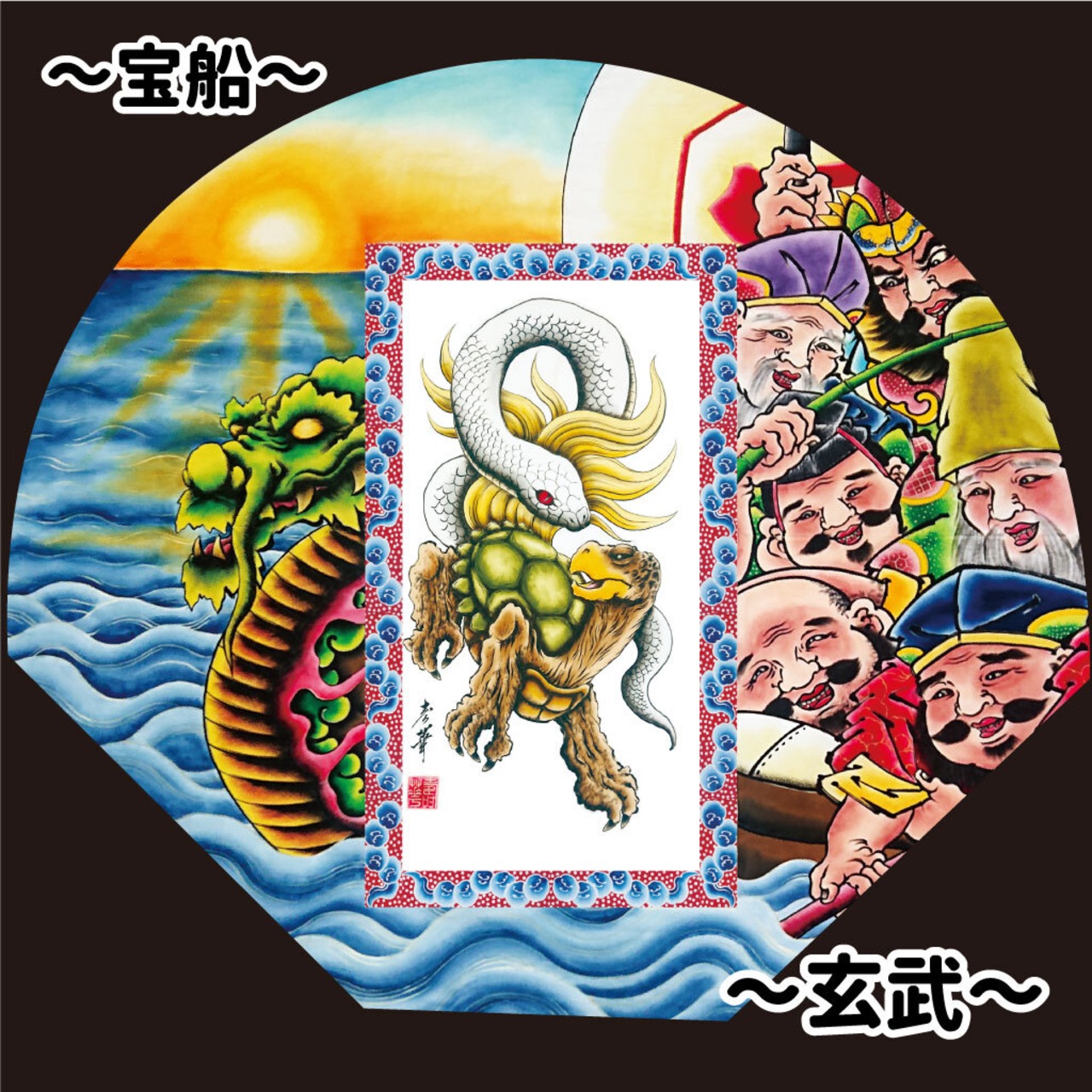 袖絵は福徳のある絵柄をと考え、初日の出の中、穏やかな海を進む宝船を描いていただきました。宝船は弁財天以外の七福神おじさんズが乗船しています。
