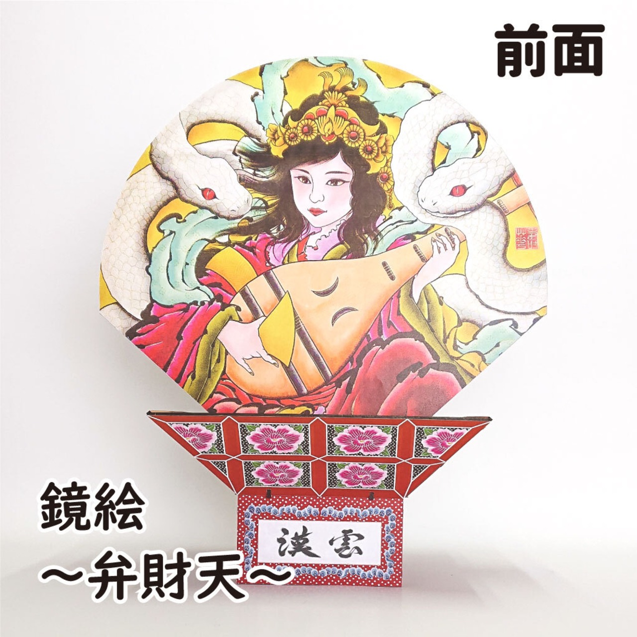 鏡絵は学問や芸事、財運にご利益のある七福神の紅一点、弁財天をたおやかに女性的な筆致で描いていただきました。両脇に居る白蛇は弁財天のお使いで、蛇は長寿、再生、子孫繁栄を暗示しています。