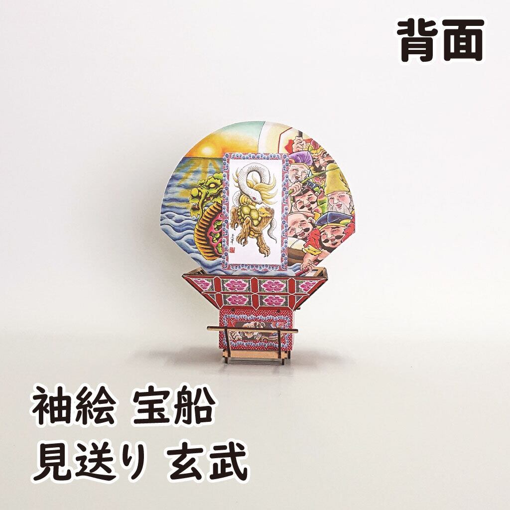 袖絵は福徳のある絵柄をと考え、初日の出の中、穏やかな海を進む宝船を描いていただきました。宝船は弁財天以外の七福神おじさんズが乗船しています。